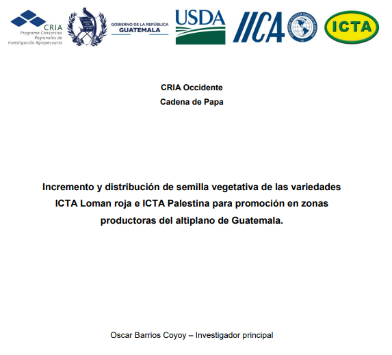 - Actualmente la producción de papa se encuentra concentrada en los departamentos de Huehuetenango, San Marcos, Quetzaltenango, Baja Verapaz y Guatemala; lo que coloca al país como el mayor productor y exportador de papa en Centroamérica. El Instituto de Ciencia y Tecnología Agrícolas, durante los últimos años ha generado dos variedades de papa que ofrecen características de tolerancia plagas del suelo como ICTA Loman roja; así mismo ha generado la variedad ICTA Palestina que presentan aspectos de calidad para agroindustria, en la elaboración de bastones fritos. A través del incremento de semilla fue posible producir semilla de calidad, la cual permitió el establecimiento de 27 parcelas de promoción por parte del Programa de Validación y Transferencia de Tecnología en los departamentos de Huehuetenango, San Marcos, Sololá y Quetzaltenango. Del mismo modo se alcanzó a beneficiar a 197 agricultores de tres departamentos del país mediante semilla de ICTA Loman roja e ICTA Palestina. Las variedades generadas por el ICTA representan una alternativa de diversificación del cultivo de papa en el Altiplano, debido a sus beneficios como alto potencial de rendimiento, cualidades culinarias y resistencia a plagas de suelo.