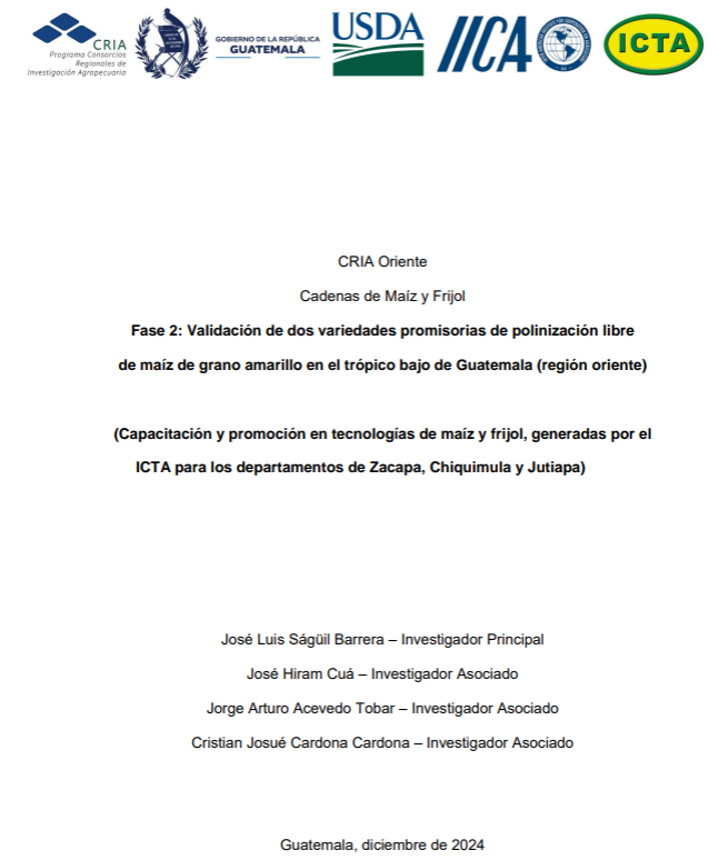 - El ICTA cumple el mandato de realizar la promoción tecnología haciendo uso de actividades como capacitaciones y las jornadas de promoción. Con la finalidad de contribuir con el proceso de promoción y transferencia de tecnología generada, validada y liberada por el ICTA, se desarrolló este proyecto con financiamiento del Programa Consorcios Regionales de Investigación Agropecuaria del Instituto Interamericano de Cooperación Agrícola (Programa CRIA-IICA), que contempló dos actividades: una capacitación dirigida a extensionistas con la temática de Identificación, monitoreo y control de plagas emergentes en maíz y frijol en el oriente de Guatemala, el caso de la chicharrita del maíz (Dalbulus maidis DeLong) y el trips de la flor del frijol (Megalurothrips usitatus Bagnall) y la jornada de promoción de tecnología en la finca el Oasis, Estanzuela, Zacapa. Con la capacitación se fortalecieron los conocimientos sobre las plagas tratadas, en 79 extensionistas, que en su mayor parte desconocían la presencia y daño de estas plagas, así como los métodos de control, despertando el interés para aplicarlas en su trabajo con los agricultores. Los resultados de la jornada de promoción indican que participaron 320 personas, integrantes de asociaciones, ONG´s, universidades y AMER´s del MAGA, de Chiquimula, Zacapa y Jutiapa, con quienes se promocionó 18 cultivares mejorados de maíz y frijol y 5 cultivos más. Resalta la importancia de continuar desarrollado las actividades de promoción de manera directa con todos los actores de la actividad agrícola para seguir estimulando el uso de la tecnología generada por el ICTA.