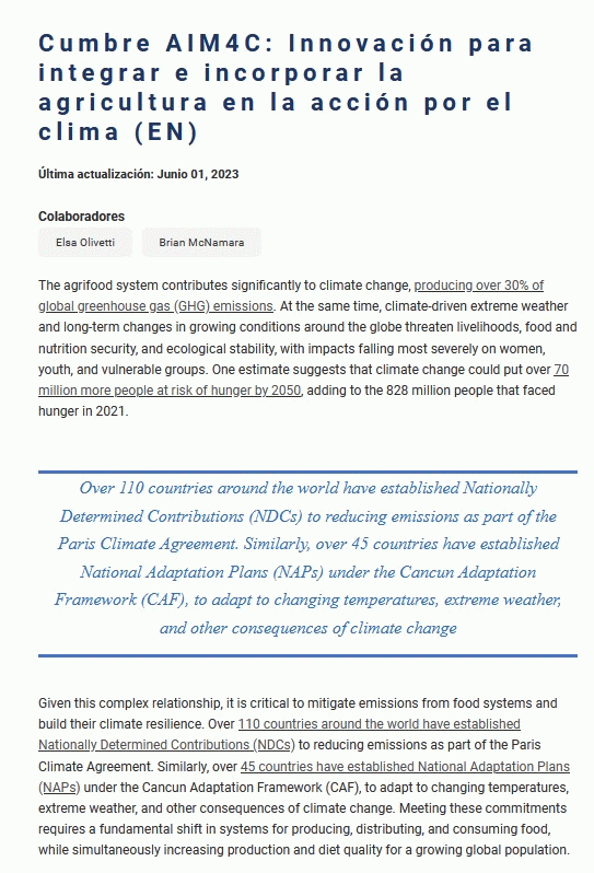 - El sistema agroalimentario tiene un impacto significativo en el cambio climático al ser responsable de más del 30% de las emisiones globales de gases de efecto invernadero. Este sistema también se ve afectado por fenómenos climáticos extremos y cambios en las condiciones de cultivo, lo que amenaza la seguridad alimentaria, los medios de vida y la estabilidad ecológica, especialmente para mujeres, jóvenes y grupos vulnerables. En la Cumbre de Innovación Agrícola para el Clima (AIM4C) en Washington, el Instituto Interamericano de Cooperación para la Agricultura (IICA) organizó una sesión sobre "Innovación para integrar y promover la agricultura en las NDC". En esta sesión, se discutieron estrategias para acelerar la innovación agrícola en términos de mitigación y adaptación al cambio climático. Se destacó la necesidad de políticas adecuadas que fomenten la ampliación de innovaciones prometedoras en el sector agrícola, lo cual requiere una modernización de los sistemas políticos e institucionales. Para implementar con éxito estas innovaciones, se deben abordar tres desafíos institucionales: fortalecer la coordinación, ampliar la financiación climática y mejorar el monitoreo y análisis de datos. La Iniciativa Integral para el Cambio Climático (CACCI) ha sido efectiva en apoyar la implementación de acciones climáticas a través de la agricultura y en fortalecer la capacidad de los actores involucrados. Estas acciones deben combinarse en un enfoque multifacético para abordar los desafíos climáticos a nivel nacional e internacional.