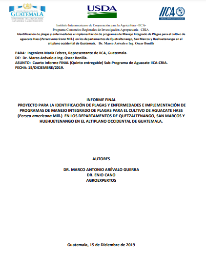 El objetivo del proyecto fue identificar plagas y enfermedades del aguacate Hass (Persea americana Mill.) en el altiplano occidental de Guatemala y proponer programas de Manejo Integrado de Plagas (MIP). La metodología incluyó el monitoreo de 100 fincas en Quetzaltenango, San Marcos y Huehuetenango, recolectando muestras de insectos y patógenos para su identificación en laboratorio. Se capacitó a productores y técnicos en MIP. Los resultados identificaron 17 plagas y 7 enfermedades, destacando la importancia económica de los barrenadores de semilla y ramas, trips y el ácaro cristalino. Se propusieron estrategias MIP específicas para cada plaga y enfermedad identificada.