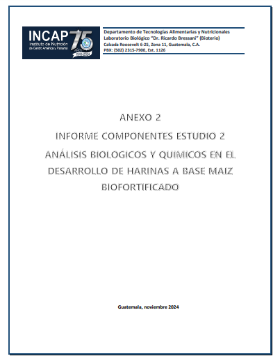 - El informe anexo presenta un estudio de componentes múltiples con el objetivo de evaluar el maíz biofortificado. La metodología incluyó un estudio biológico y químico de harinas a base de maíz biofortificado y soya, el desarrollo de harinas nutricionalmente mejoradas, un estudio de biodisponibilidad de hierro y un estudio de aceptabilidad de productos alimentarios elaborados con estas harinas. Los resultados mostraron que el maíz biofortificado, especialmente en combinación con soya, tiene un alto potencial para mejorar el perfil nutricional, aunque se identificaron desafíos en la conservación del grano. Se concluye que el maíz biofortificado es una herramienta prometedora para combatir deficiencias nutricionales, pero requiere estrategias complementarias para el almacenamiento y la diversificación de productos para maximizar su impacto.