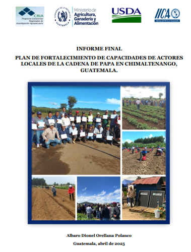 - El informe final tiene como objetivo presentar los resultados de los espacios de fortalecimiento de capacidades de los actores locales en la cadena de valor de la papa en Chimaltenango. La metodología incluyó diversas actividades de capacitación, incluyendo temas de establecimiento de parcelas, buena sprácticas agrícolas, control de plagas, manejo de semillas certificadas y elaboración de bioinsumos. Para cada una de ellas se contó con la participación de agricultores y otros actores de la comunidad, por lo cual se pudo concretar la transferencia de tecnología y conocimiento relacionados con el cultivo de papa.