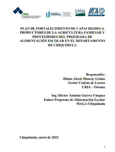 - El objetivo del plan es fortalecer las capacidades de los productores de la agricultura familiar que proveen al Programa de Alimentación Escolar (PAE) en Chiquimula, Guatemala, para mejorar sus procesos de producción, cosecha, postcosecha y distribución mediante la implementación de nuevas tecnologías. La metodología consistió en un diagnóstico participativo, realizado el 8 de diciembre de 2022, con productores y delegados del MAGA para identificar y priorizar sus necesidades de fortalecimiento. Como resultado, se elaboró un plan de capacitación que aborda temas priorizados.