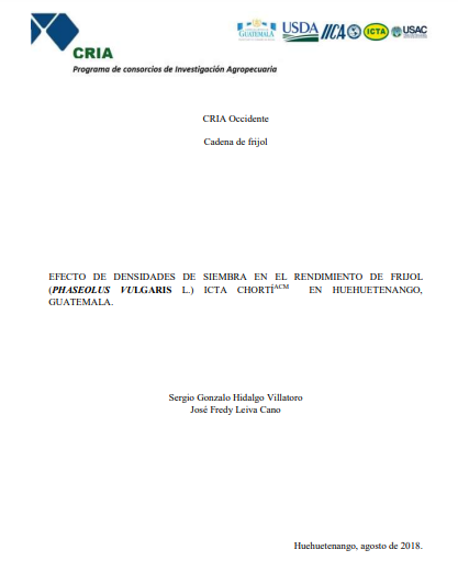 - El objetivo del estudio fue evaluar el efecto de tres densidades de siembra sobre el rendimiento de la variedad de frijol ICTA ChortíACM en Huehuetenango, Guatemala. La metodología consistió en establecer ensayos en dos localidades utilizando un diseño de bloques completos al azar con tres densidades: 200,000, 250,000 y 300,000 plantas/ha. Los resultados no mostraron diferencias estadísticamente significativas en el rendimiento de grano entre las densidades. Sin embargo, la mayor producción numérica (1,847.45kg/ha) se obtuvo con la densidad más alta de 300,000 plantas/ha.