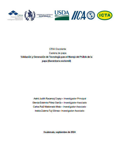 - El psílido de la papa (Bactericera cockerelli Sulc.), es una de las principales plagas que genera pérdidas económicas considerables en el cultivo de papa, al afectar la fisiología de la planta y transmitir una bacteria (Candidatus Liberibacter solanacearum). Para el manejo del agente patógeno, el principal enfoque es disminuir la presencia del vector en las plantaciones. En el Centro de Producción de ICTA, en Quetzaltenango, se evaluaron cinco composiciones de moléculas químicas de los grupos tres, cuatro y 23 (Piretroides, Neonicotinoides y Tetronic) [Thiamethoxam + Lambda-cyalotrina (4A+3A); Imidacloprid + Deltrametrin (4A+3A); Beta-cyfluthrin+ Thiacloprid (4A); Spirotetramate (23); Spiropidion+ Acetamiprid (23 + 4A)]. Así mismo, en instalaciones del laboratorio del Programa de Protección Vegetal de ICTA, en Chimaltenango, se realizaron bioensayos para evaluar el efecto de Neonicotinoides, Piretroides, Butenolides, Tetronic y Carbamatos sobre adultos y ninfas del psilido de la papa. En las evaluaciones realizadas, se corrobora que los Neonicotinoides presentan una alta eficacia sobre los especímenes de B. cockerelli; en campo favoreció en la diminución de la población de adultos, ninfas y huevos; a nivel de laboratorio también fueron las moléculas que presentaron el mayor porcentaje de eficacia según la fórmula de Abbott. En campo, el uso de Spiropidion + Acetamiprid (23 + 4A) generó un efecto en la disminución del nivel poblacional del psílido. Para disminuir la probabilidad que la plaga genere resistencia en el plan de manejo se deben incluir otras moléculas que no pertenezcan a los grupos tres y cuatro (Piretroides y Neonicotinoides).