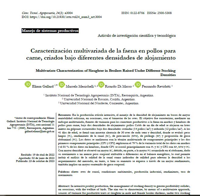 - En la producción avícola intensiva, el manejo de la densidad de alojamiento en busca de mayor rentabilidad colisiona, en ocasiones, con el bienestar de las aves. El objetivo fue caracterizar, mediante un enfoque multivariado, fuentes de variancia para los caracteres productivos a la faena en machos y hembras de pollos para carne, bajo dos densidades de alojamiento: pollos Cobb de un día de edad se alojaron en lotes mixtos en galpones oscurecidos bajo dos densidades: estándar (14 pollos/m2) y reducida (12 pollos/m2). A los 41 días de edad, se faenó una muestra aleatoria de 30 aves de cada sexo y densidad, donde se evaluó: peso limpio (PL), rendimiento de la canal (RC), de pata-muslo (RPM), de pechuga (RP) y proporción de grasa abdominal (PG). Los datos se analizaron con la técnica multivariada de componentes principales y los dos primeros componentes principales (CP1 y CP2) explicaron el 79 % de la variancia total de los datos en machos y el 81 % de los datos en hembras, donde CP1 se asoció principalmente con PL y RC y CP2 con RP, RPM y PG. Con mayor densidad se observó un mayor RC, debido, en parte, a la mayor PG acumulada en el abdomen, dado su crecimiento a un menor peso corporal atribuible a diferencias en el balance energético, lo cual permite incluir el análisis de la calidad de la canal como indicador de utilidad para adecuar la densidad a los requerimientos del mercado, en tanto, si bien su aumento se expresa a través de un mayor rendimiento, también implica un mayor contenido de grasa corporal.