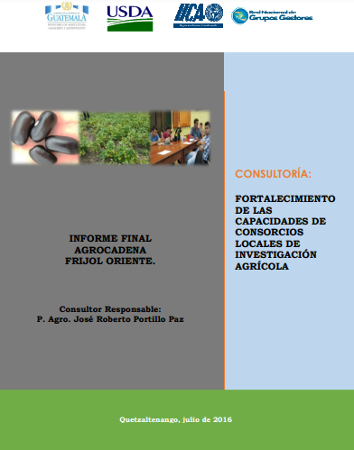 - Este informe final analiza la agrocadena del frijol en la región oriente de Guatemala. El objetivo principal fue fortalecer las capacidades de los consorcios locales para gestionar proyectos de investigación agrícola. La metodología incluyó la identificación de actores, mapeo de la cadena, análisis de prácticas y tecnologías, y la identificación de temas de investigación. Se identificaron cuatro eslabones principales: producción, postcosecha, transformación y consumo. Los resultados destacaron limitaciones en el acceso a recursos, capacitación y mercados, así como la necesidad de mejorar la coordinación entre los actores de la cadena. Se concluyó que el fortalecimiento de las capacidades locales y la investigación aplicada son cruciales para el desarrollo de la agrocadena del frijol en la región.