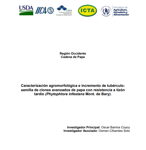 - Guatemala es el principal productor de semilla de papa en Centroamérica, concentrando cerca del 85% de la producción en tres departamentos. La variedad más utilizada es Loman, que, aunque tiene buen rendimiento y aceptación en el mercado, es muy susceptible al tizón tardío, lo que genera un uso excesivo de fungicidas y afecta los costos, el ambiente y la salud. Para abordar esta situación, el Instituto de Ciencia y Tecnología Agrícolas (ICTA) seleccionó y evaluó cinco clones de papa con resistencia moderada a Phytophthora infestans. Su metodología incluye la producción de semilla de calidad, la validación mediante ensayos de finca y parcelas de prueba, y la caracterización agromorfológica de los clones. Según el Programa de Validación y Transferencia de Tecnología del ICTA, el clon TG7 presentó las mejores cualidades de resistencia, rendimiento y características comerciales, estableciéndose con su semilla siete ensayos de finca y treinta parcelas de prueba en el Altiplano Central y Occidental, considerando treinta y cuatro descriptores de planta, tallo, hoja, fruto, flor, tubérculo y brote.