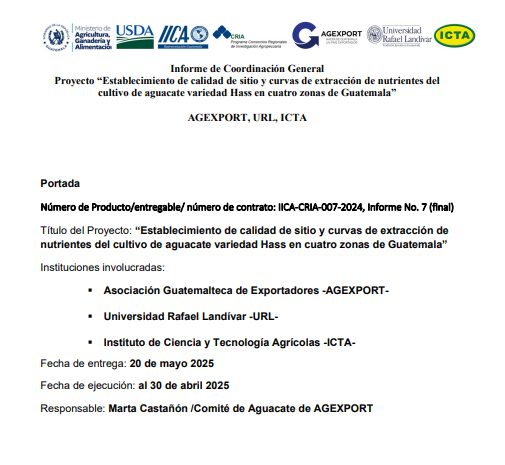 - El objetivo de este proyecto fue establecer la calidad de sitio y las curvas de extracción de nutrientes del cultivo de aguacate Hass en cuatro zonas productoras de Guatemala. La metodología implicó la realización de un estudio en campo e invernadero, en colaboración entre AGEXPORT, la Universidad Rafael Landívar y el ICTA. Se analizaron muestras de tejidos vegetales y suelo para determinar los requerimientos nutricionales de la variedad Hass en diferentes etapas de crecimiento. Los resultados permitieron identificar las curvas de extracción de nutrientes específicas para el aguacate Hass bajo las condiciones de las zonas estudiadas, así como la relación entre la calidad del sitio y la absorción de nutrientes. Esta información es crucial para optimizar los programas de fertilización. Se concluyó que la aplicación de los hallazgos de este estudio contribuirá al desarrollo de una producción de aguacate más sostenible y competitiva en Guatemala, al mejorar la productividad y la calidad del fruto mediante un manejo nutricional preciso y adaptado a las condiciones locales.