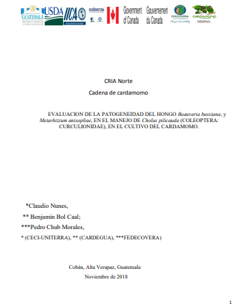 - El estudio evaluó la patogenicidad de los hongos Beauveria bassiana y Metarhizium anisopliae en el control de Cholus pilicauda, una plaga del cardamomo en Guatemala. Se realizaron ensayos en varias localidades de Alta Verapaz y Quiché, comparando la efectividad de los hongos. Los resultados mostraron que M. anisopliae controló la plaga en áreas con baja cobertura forestal y humedad, mientras que B. bassiana fue efectivo en áreas con alta humedad y cobertura superior al 60%. Se concluyó que la efectividad de estos hongos depende de las condiciones ambientales, siendo recomendables en áreas con alta humedad y cobertura vegetal.