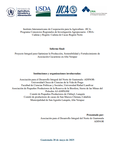 - El proyecto tuvo como objetivo optimizar la producción, sostenibilidad y fortalecimiento de asociaciones cacaoteras en Alta Verapaz, Guatemala. La metodología incluyó el establecimiento de parcelas experimentales y capacitaciones sobre aspectos técnicos del cultivo de cacao, como el manejo de enfermedades y plagas, y la optimización de la fermentación y secado. Se enfatizó la transferencia de tecnología para mejorar la calidad del cacao y diversificar la producción mediante sistemas agroforestales. Los resultados muestran una mejora en las prácticas de cultivo y poscosecha, así como el fortalecimiento de las capacidades organizativas y comerciales de las asociaciones. En conclusión, el proyecto contribuyó a la mejora de la productividad y sostenibilidad de la cadena de valor del cacao, impactando positivamente en la economía local y la conservación del medio ambiente.