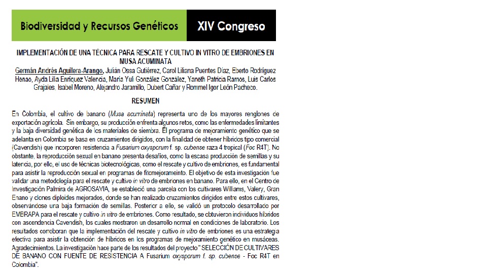 - En Colombia, el cultivo de banano (Musa acuminata) representa uno de los mayores renglones de exportación agrícola. Sin embargo, su producción enfrenta algunos retos, como las enfermedades limitantes y la baja diversidad genética de los materiales de siembra. El programa de mejoramiento genético que se adelanta en Colombia se basa en cruzamientos dirigidos, con la finalidad de obtener híbridos tipo comercial (Cavendish) que incorporen resistencia a Fusarium oxysporum f. sp. cubense raza 4 tropical (Foc R4T). No obstante, la reproducción sexual en banano presenta desafíos, como la escasa producción de semillas y su latencia, por ello, el uso de técnicas biotecnológicas, como el rescate y cultivo de embriones, es fundamental para asistir la reproducción sexual en programas de fitomejorameinto. El objetivo de esta investigación fue validar una metodología para el rescate y cultivo in vitro de embriones en banano. Para ello, en el Centro de Investigación Palmira de AGROSAVIA, se estableció una parcela con los cultivares Williams, Valery, Gran Enano y clones diploides mejorados, donde se han realizado cruzamientos dirigidos entre estos cultivares, observándose una baja formación de semillas. Posterior a ello, se validó un protocolo desarrollado por EMBRAPA para el rescate y cultivo in vitro de embriones. Como resultado, se obtuvieron individuos híbridos con ascendencia Cavendish, los cuales mostraron un desarrollo normal en condiciones de laboratorio. Los resultados corroboran que la implementación del rescate y cultivo in vitro de embriones es una estrategia efectiva para asistir la obtención de híbridos en los programas de mejoramiento genético en musáceas. Agradecimientos. La investigación hace parte de los resultados del proyecto " SELECCIÓN DE CULTIVARES DE BANANO CON FUENTE DE RESISTENCIA A Fusarium oxysporum f. sp. cubense-Foc R4T en Colombia".