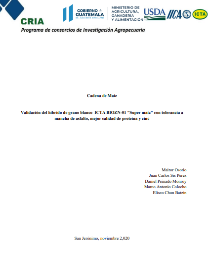 Validación del híbrido de grano blanco ICTA BIOZN-01 "Super maíz" con tolerancia a mancha de asfalto, mejor calidad de proteína y cinc Report uri icon