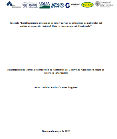 - El objetivo de esta investigación fue determinar las curvas de extracción de nutrientes del cultivo de aguacate Hass en etapa de vivero. La metodología consistió en un estudio en invernadero, analizando las propiedades fisicoquímicas del suelo y las concentraciones de nutrientes en los tejidos vegetales del aguacate Hass en diferentes fases de crecimiento. Se trabajó en colaboración con AGEXPORT, la Universidad Rafael Landívar y el ICTA. Los resultados revelaron las cantidades de nutrientes (N, P, K, Ca, Mg, S y micronutrientes) que el aguacate Hass extrae del suelo durante su desarrollo en vivero. Se observó una correlación entre las propiedades del suelo y la absorción de nutrientes por parte de las plantas. Se concluyó que la información obtenida es fundamental para desarrollar programas de fertilización más eficientes y sostenibles en la etapa de vivero del aguacate Hass. Esto permitirá un mejor establecimiento de las plantas, optimizando su crecimiento inicial y contribuyendo a la productividad futura del cultivo en Guatemala.