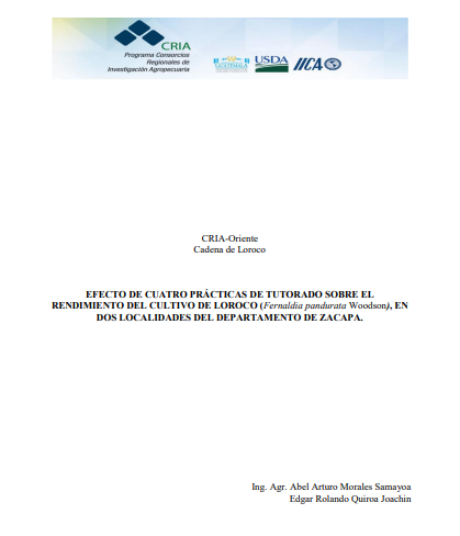 - Este estudio evaluó el efecto de cuatro prácticas de tutorado en el rendimiento del cultivo de loroco en dos localidades de Zacapa. La metodología consistió en establecer experimentos de campo con cuatro sistemas de tutorado diferentes. El objetivo principal fue identificar el sistema más efectivo para incrementar la producción. Los resultados mostraron que los sistemas de espaldera de cuatro hilos y la variante de cuatro surcos fueron los más efectivos, logrando aumentos significativos en el rendimiento del loroco.