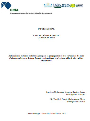 - El proyecto evaluó métodos biotecnológicos para la propagación de tres variedades de papa (Loman, Ictafrit y Tollocan) con el objetivo de producir tubérculo-semilla de alta calidad fitosanitaria en Guatemala. Se compararon tres métodos: In Vitro (transplante directo de vitroplantas a invernadero), Bandeja (vitroplantas a bandejas previo a invernadero) y SAH (Sistema Autotrófico Hidropónico). No se encontraron diferencias significativas entre métodos para la sobrevivencia de plántulas y número de tubérculos en las variedades Loman e Ictafrit. Para la variedad Tollocan, los métodos Bandeja y SAH mostraron mayor sobrevivencia. En peso de tubérculo, el método Bandeja fue superior para las variedades Loman y Tollocan. Se concluyó que el método Bandeja es promisorio para la producción de tubérculo-semilla de alta calidad. Se recomienda validar los resultados con productores de semilla de papa en otros departamentos de Guatemala.