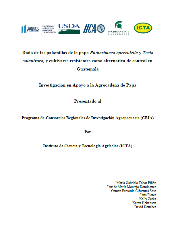 - La palomilla de la papa es una plaga clave en Guatemala, donde se identifican dos especies que afectan el rendimiento del cultivo. La investigación tuvo como objetivo evaluar sus daños y fortalecer capacidades en el manejo de organismos genéticamente modificados (OGMs). Se realizaron trece ensayos nacionales midiendo presencia de adultos de palomillas, daños en tallos, foliolos y tubérculos, y rendimiento bajo distintos tratamientos con insecticidas. Los resultados muestran que sin control, las pérdidas pueden alcanzar 68% en campo y 36% en almacenamiento. En un estudio confinado con el clon MSZ19-13 se observó mayor rendimiento, resistencia a P. infestans y al virus Y, además de buenas características agronómicas y culinarias. El proyecto incluyó un manual de procedimientos y un taller sobre regulaciones de OGMs, destacando la relevancia de esta biotecnología para el control de la plaga y el mejoramiento genético.