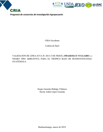- El objetivo del estudio fue validar el genotipo de frijol negro ICTA JU 2013-3, evaluando su rendimiento, estabilidad ambiental y aceptabilidad en el trópico bajo de Huehuetenango, Guatemala. La metodología se basó en el establecimiento de 20 parcelas de prueba pareadas, donde se comparó el nuevo genotipo contra el testigo utilizado por el agricultor local. Los resultados demostraron que la línea ICTA JU 2013-3 superó significativamente en rendimiento al testigo y mostró una alta aceptabilidad en pruebas vegetativas, reproductivas y gustativas por parte de los agricultores.