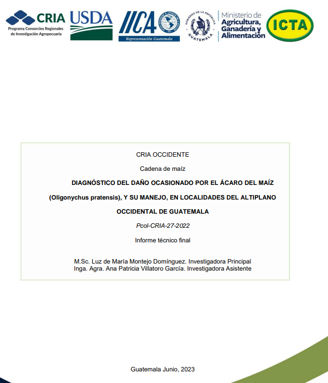 Maíz es esencial en la dieta guatemalteca; en la zona del Altiplano Occidental es cultivado mayormente por pequeños productores, gran parte es destinado para el consumo del hogar. Para este cultivo generalmente se destinan tierras marginales. Por lo tanto, los pequeños productores no suelen invertir mucho en insumos para su manejo. Durante el 2019, productores de Quetzaltenango y Totonicapán reportaron daños en su cultivo. El Viceministerio de Sanidad Agropecuaria y Regulaciones (VISAR), así como el Instituto de Ciencia y Tecnología Agrícolas -ICTA realizaron giras de campo y muestreos preliminares, reportando entre 50-100% de pérdidas de rendimiento; la plaga fue identificada como Oligonychus pratensis. Éste es conocido como el ácaro del pasto o de las gramíneas y ha sido reportado en Estados Unidos, México, América Central y algunas zonas del Caribe. En ese sentido, se realizó el diagnóstico de áreas con incidencia y daño de esta plaga en parcelas de maíz de agricultores de Quetzaltenango y Totonicapán. Los municipios de Quetzaltenango con presencia del ácaro fueron: Olintepeque, Cantel, San Mateo, San Juan Ostuncalco, Concepción Chiquirichapa, Salcajá, Quetzaltenango y San Miguel Sigüilá. En Totonicapán: San Andres Xecúl, San Francisco el Alto, San Cristobal Totonicapán, Totonicapán, Momostenango, y Santa María Chiquimula. Este ácaro crece idealmente a temperaturas promedio 30-32°C, sin embargo, se ha observado su adaptación en estas zonas que varían de 4°C hasta 23°C durante los meses más cálidos. En dichas localidades, los conteos de estadios móviles variaron de 0-45 (en el 10% de la hoja). El número de huevos varió de 0-88. A su vez, se realizó la evaluación de eficiencia de moléculas. Como resultado, Pyridaben y Abamectina fueron las moléculas más eficaces (69%; 68% de control, respectivamente) bajo alta incidencia. El azufre fue eficaz como preventivo o control en bajas poblaciones. Se observó que la rotación y diversificación de cultivos disminuye la incidencia de la plaga, y que la eliminación de plantas voluntarias es clave para reducir infestaciones tempranas.