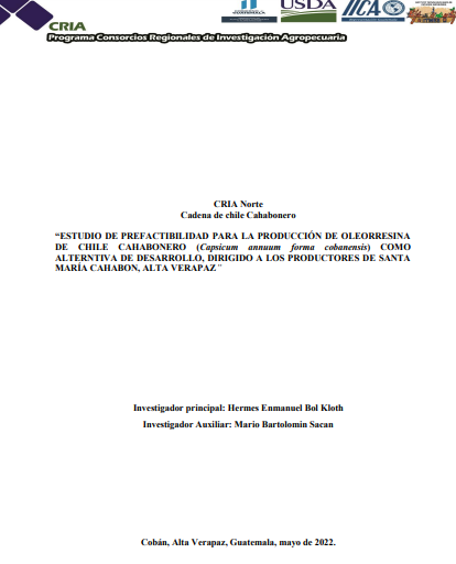 - El estudio tuvo como objetivo realizar un estudio de prefactibilidad para la producción de oleorresina de chile cahabonero (Capsicum annuum forma cobanensis) como alternativa de desarrollo para productores de Santa María Cahabón, Alta Verapaz. La metodología incluyó la evaluación de aspectos técnicos, económicos y de mercado para determinar la viabilidad del proyecto. Los resultados se enfocaron en ofrecer una alternativa productiva que agregue valor al chile cahabonero en la región.